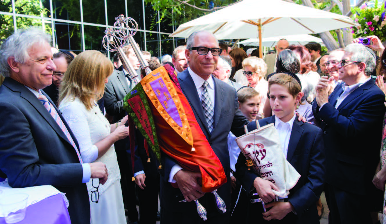 Lee Samson holding one of the sifrei Torah at the double Torah dedication by the Samson family held in Los Angeles this past August in memory of his late wife, Anne, a”h. Photo: David Michael Photography